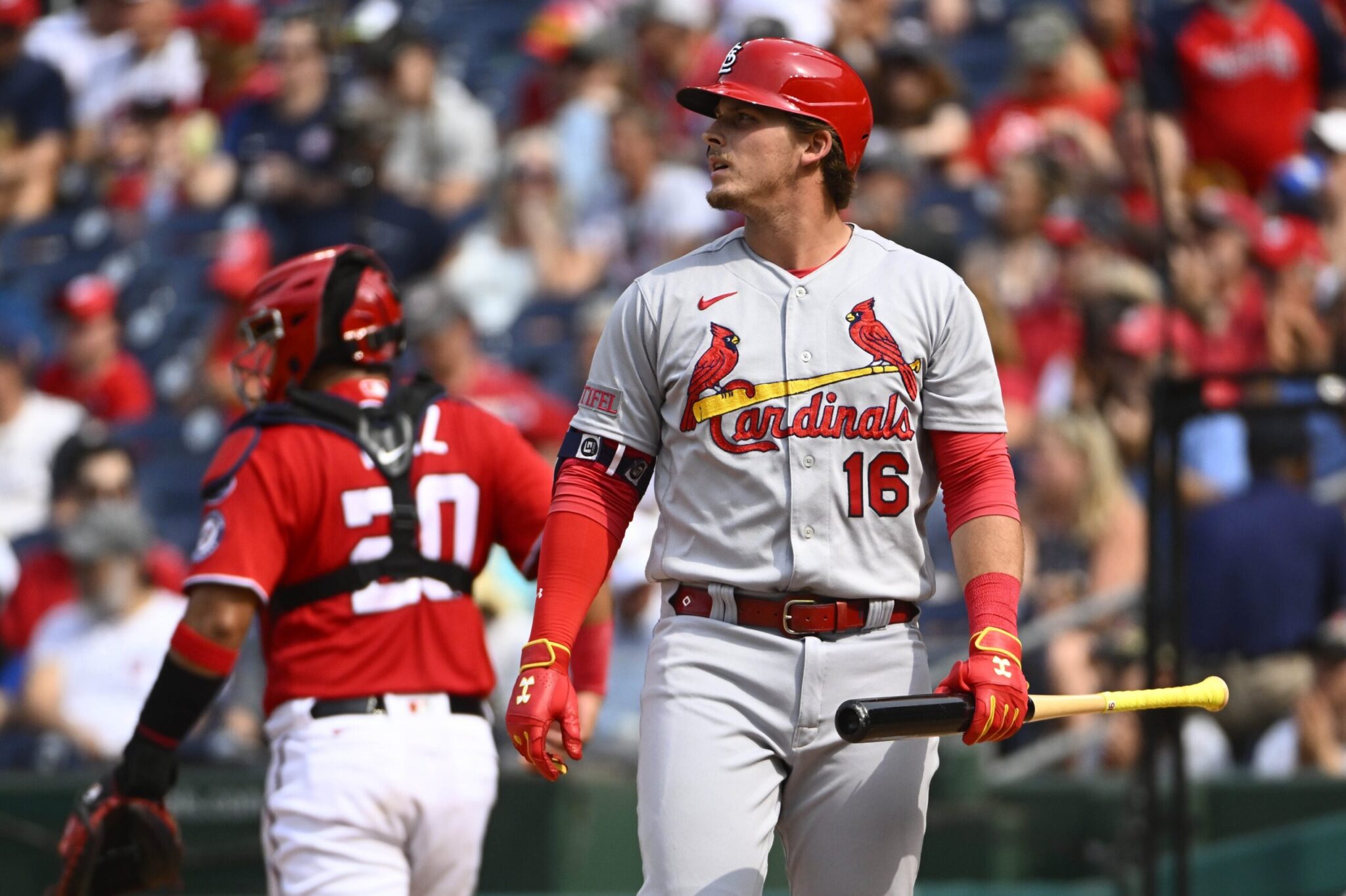 Jun 19, 2023; Washington, District of Columbia, USA; St. Louis Cardinals second baseman Nolan Gorman (16) reacts after striking out during the second inning against the Washington Nationals at Nationals Park. Mandatory Credit: Brad Mills-USA TODAY Sports